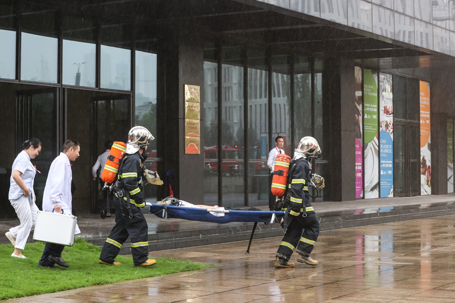 当天下午,演练假设天安数码城5栋3楼发生火灾,火势迅速蔓延,同时产生大量浓烟,值班人员发现后立即启动手动报警器,消防控制室先行启动应急程序,同时拨打119报警,微型消防站队员迅速组成自救小组,开展自救工作,利用灭火器和室内消火栓进行初期灭火和疏散人员。