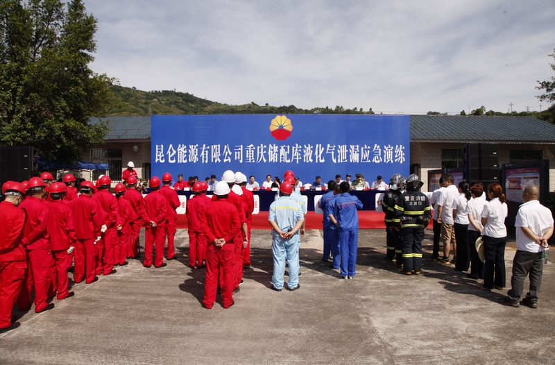为全面检验辖区综合应急救援队伍处置突发性灾害事故能力和协同作战能力, 6月26日,重庆市大渡口区多部门联合在重庆昆仑能源有限公司开展液化气储配库泄漏应急演练。公安、消防、安监、卫生、环保等13个部门、企业,共计200余人参加演练。